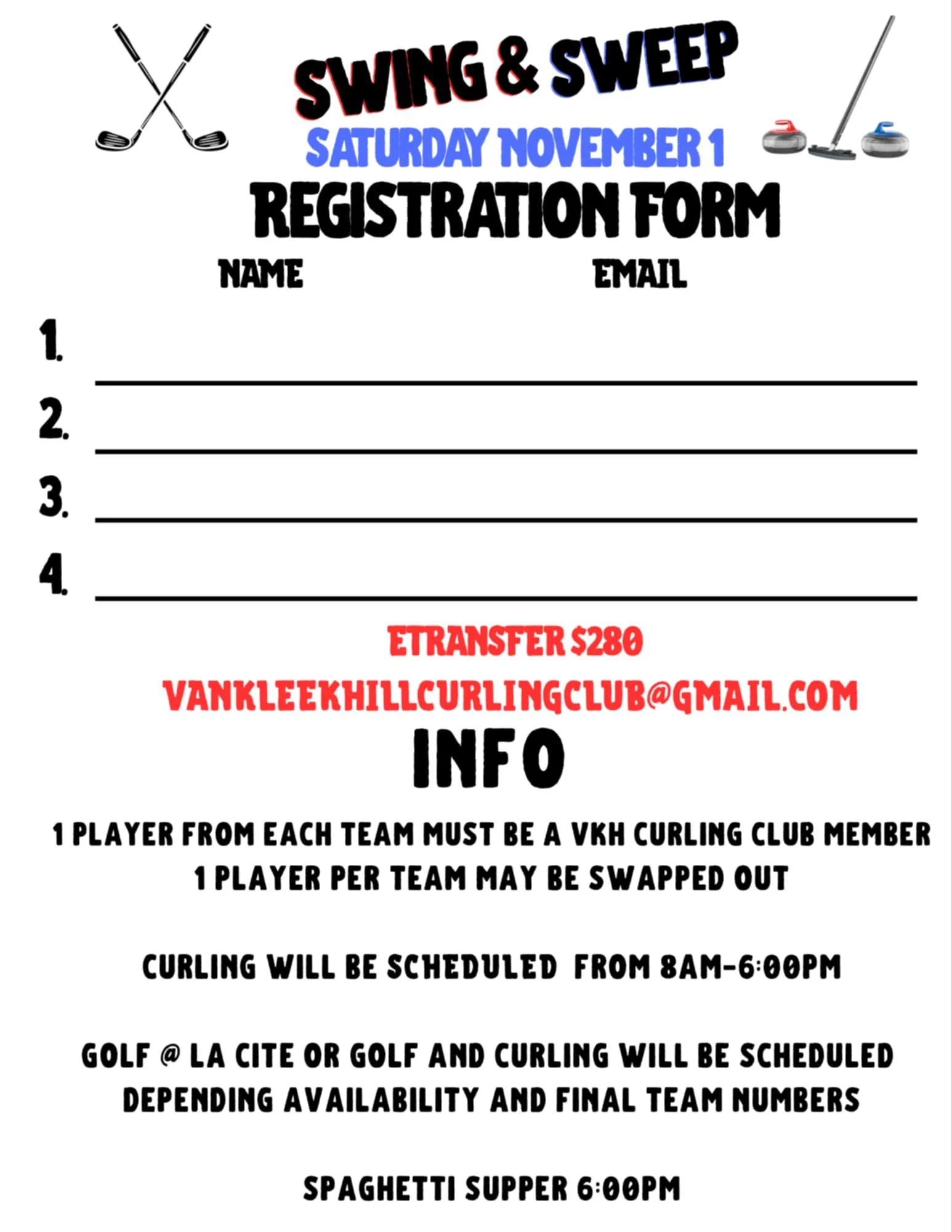 Please reach out to Dom Sauve Email : domsauve@hotmail.com or cell : 613-677-8687 for more details. Email will be sent closer to the event with tee off times and curling agenda.